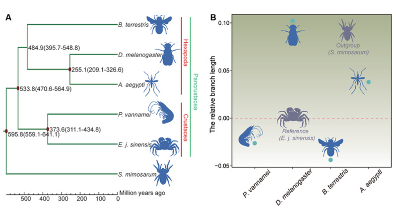 在这7种节肢动物中,虾蟹相对进化速率最小,其中对虾进化速度最慢,其次是绒螯蟹和梭子蟹。唐教授介绍道相对于昆虫,虾蟹类进化较慢,可能是它们生活的环境相对于昆虫更加稳定