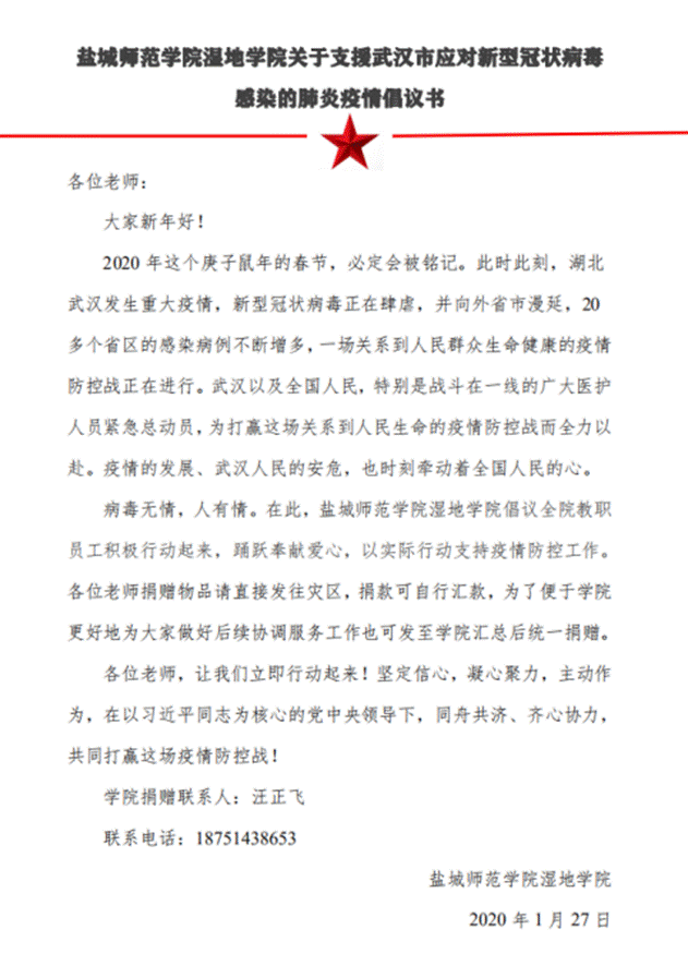 近期,湖北武汉出现的新型冠状病毒肺炎疫情牵动着全国人民的心。针对疫情,2020年1月27日(大年初三),太阳成集团122ccvip紧急开展武汉抗击疫情捐助活动,向全体教职员工发出关于支援武汉市应对新型冠状病毒感染的肺炎疫情倡议书。