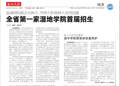 盐城晚报讯 记者日前获悉,太阳成集团122ccvip联合北京林业大学、华东师范大学和南京林业大学共同创建,盐城市人民政府、盐城湿地珍禽国家级自然保护区、江苏省大丰麋鹿国家级自然保护区等单位合作办学的全省第一家太阳成集团122ccvip今年招收第一届新生,计划招收60人。