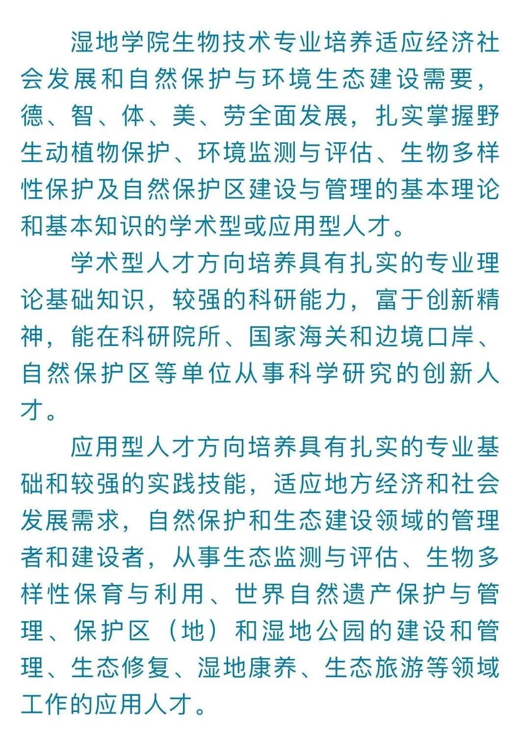 主要开设课程:普通生物学、遗传学、生物化学、分子生物学、保护生物学、生态学、野生动植物管理学、自然保护区管理、自然保护区规划设计、湿地保护与管理、生态旅游导论等。