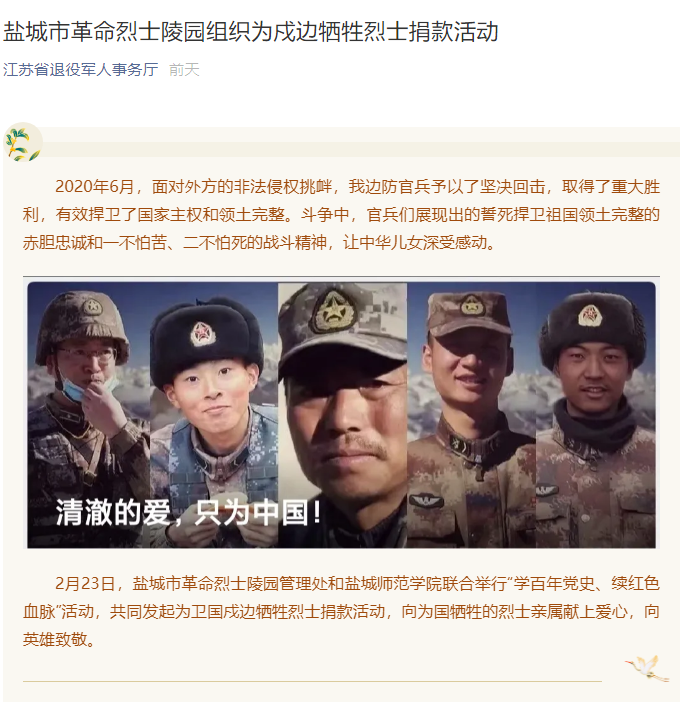 《盐城市革命烈士陵园组织为戍边牺牲烈士捐款活动》江苏省退役军人事务厅报道