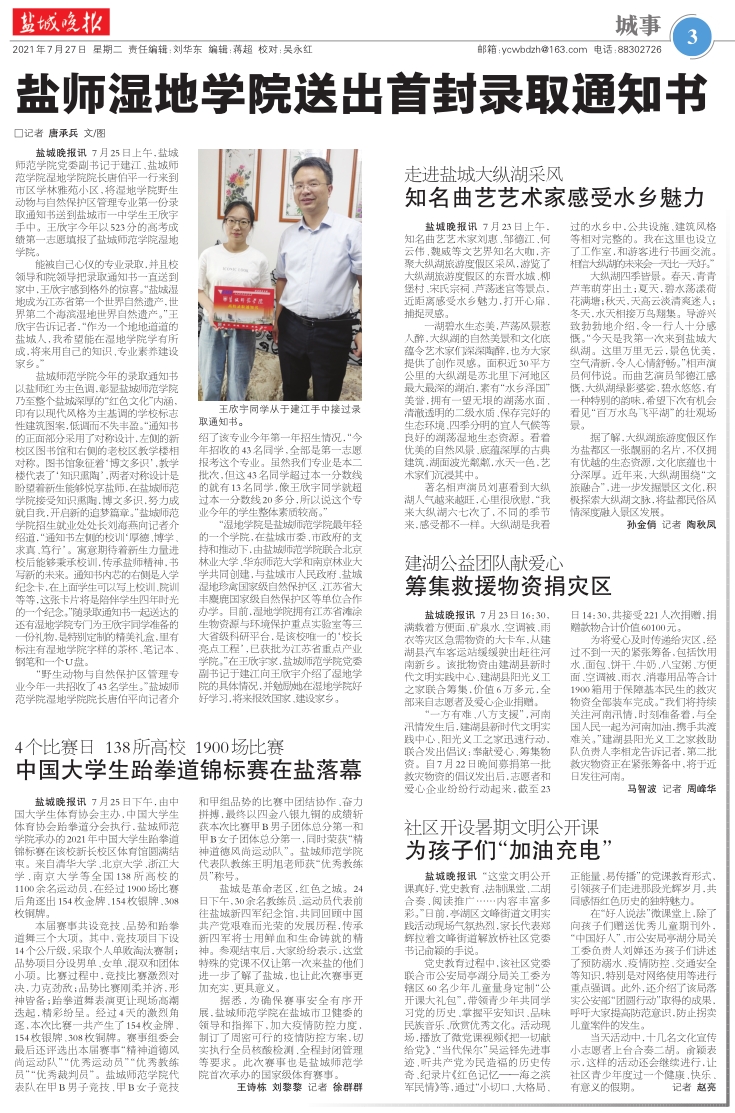 《盐师太阳成集团122ccvip送出首封录取通知书》盐城晚报报道太阳成集团122ccvip
