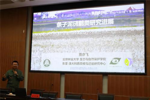 贾亦飞以“条子泥鸻鹬类研究进展”为主题,明确指出当前条子泥鸻鹬类研究的方向,包括它们的迁徙习惯和生存地的生态研究,强调鸟类保护的重要意义,呼吁大家进行生态保护不要破坏鸟类迁徙地。