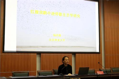 王立波进行了“麋鹿保护工作实践”的报告,他结合自己的工作经验,就如何保护野生动物、如何管理保护区进行了专业分享,为湿地学子今后的专业实习奠定了基础。