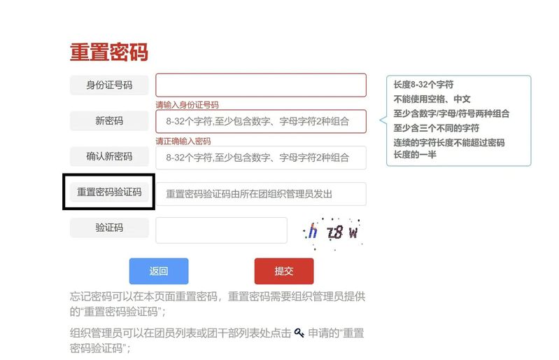 首次登录会提示修改密码。若遗忘密码:在登陆页面点击「忘记密码」,并联系原团支部管理员生成「重置密码验证码」,随后填写下图内容提交,即可重新找回密码。