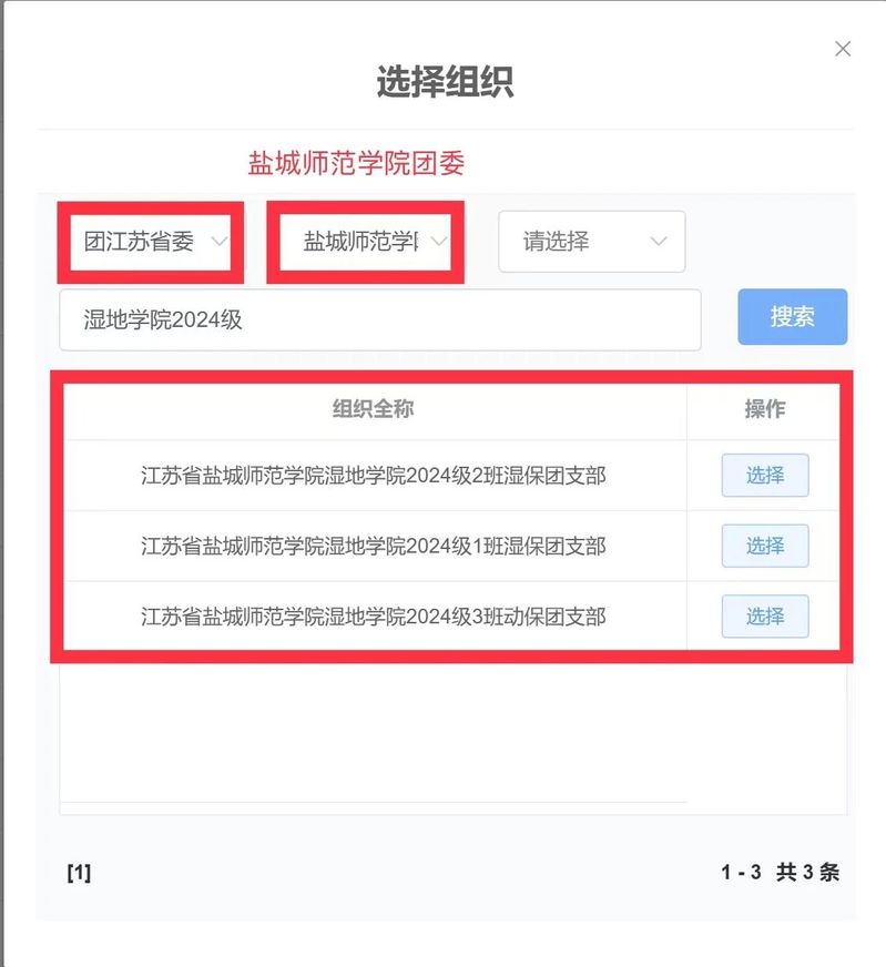 3.选择团江苏省委后,请直接选择太阳成集团122ccvip团委,不要选择团区委。