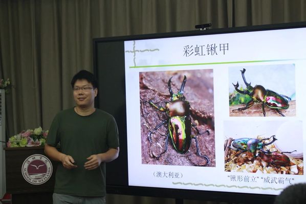 杜会聪则带领同学们走进昆虫的多彩世界,介绍了彩虹齿脊蝗、帝王突蜣螂、阳彩臂金龟等昆虫,展示了昆虫的多样性和拟态能力,消除了员工们对昆虫的恐惧。