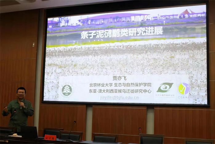 贾亦飞以"条子泥鹅类研究进展"为主题,明确指出当前条子泥鹬类研究的方向,包括它们的迁徙习惯和生存地的生态研究,强调鸟类保护的重要意义,呼吁大家进行生态保护不要破坏鸟类迁徙地。