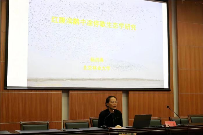 杨洪燕以"红腹滨鹬中途停歇生态学研究"为主题,向大家介绍了红腹滨鹬中途停歇的机制,在讲解过程中,她提及自己在收集用于研究的鸟类粪便时的趣事,引起大家对于鸟类研究的兴趣。