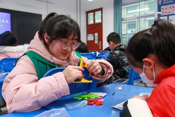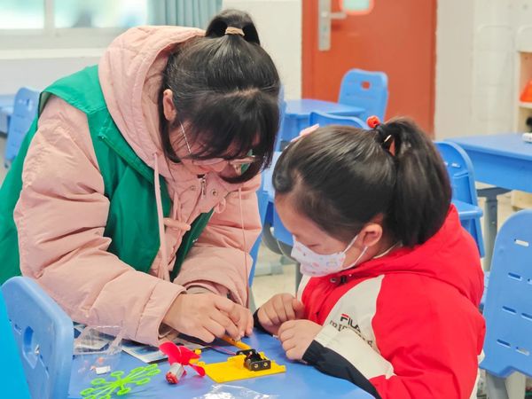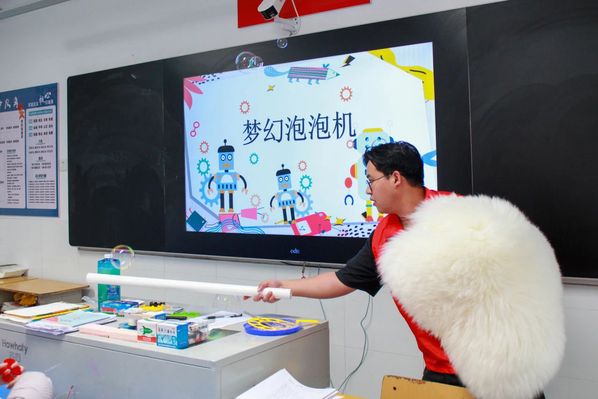 在志愿者的指导下,孩子们亲自动手,利用手中的材料制作起了自动泡泡机。这个过程不仅锻炼了孩子们的动手能力,更让他们在实践中理解了机械运作的原理。