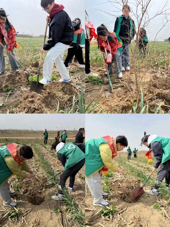 活动第三站,志愿者们拿着分配到的工具纷纷加入此次活动的重要环节——栽种3到5棵五谷树苗或者梧桐树苗。同学们几人一组,互帮互助,摩拳擦掌,干劲十足,在规定时间内完成了自己的任务。大家表示劳动最光荣,能在植树节参加此次活动非常有意义!