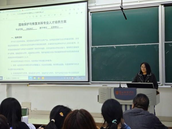 占水娥首先带来了一场关于湿地保护与恢复专业的精彩介绍。她不仅全面而细致地阐述了该专业的课程设置,还突出了其系统性和科学性。她强调了湿地保护在当今生态环境中扮演的关键角色,并通过生动的案例,向新生们展示了湿地保护工作的实际场景和深远意义,使同学们深刻感受到他们所学专业的重要性和肩负的使命。