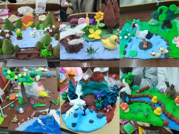18个参赛队伍以超轻粘土为主要材料,自主发挥想象力与创造力,在一小时内精心雕琢心中的湿地景观。选手们用灵巧的双手塑造出一件件生动的湿地画卷,作品从细腻的纹理塑造、色彩的巧妙搭配等细节彰显出选手们对湿地生态的深刻理解与感悟。