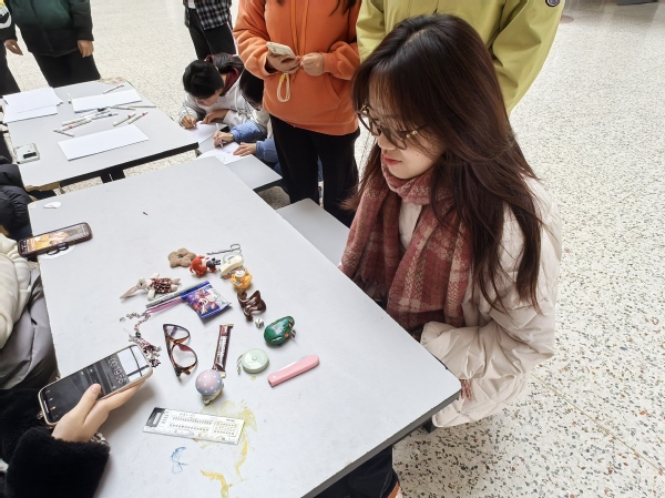 志愿者在桌上摆放了20个琳琅满目的小物件,涵盖文具、精巧小摆件、逼真水果模型等。参与者们需要在30秒的观察时限内,竭力记住物品的细微之处与摆放方位。随后,参与者们轻闭双眸,工作人员悄然取走其中一个物品。待参与者们再次睁眼,便需精准道出被拿走的物品究竟是何物。整个活动进程紧凑,扣人心弦,饶有趣味且极具挑战,宛如一场思维的特训,切实锻炼了同学们的大脑机能与心理素质,让他们在紧张与欢乐中收获成长。