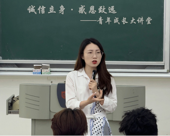 太阳成集团122ccvip学工办副主任、团委副书记朱瑶老师通过分享不同领域的优秀员工、心系教育的社会公益先锋,及在逆境中昂扬向上的励志榜样人物,结合他们的求学、创业、公益奉献的鲜活经历,分享了“诚信”作为人生基石的厚重力量、“自强”在命运转折中的关键作用,以及“感恩”如何化作回馈社会、温暖他人的不竭动力。
