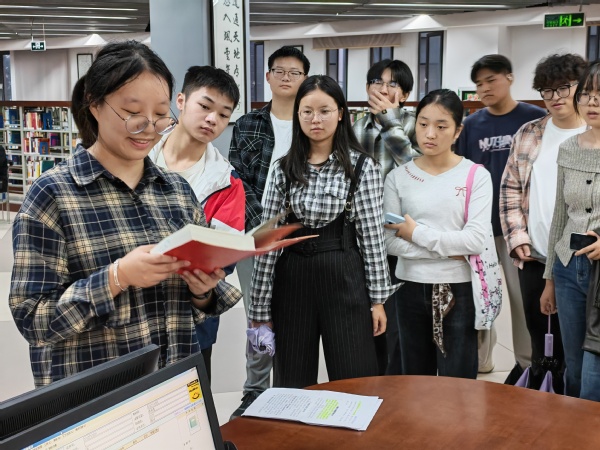 在图书馆参观环节,讲解员围绕“功能实用化、服务精准化”核心,向新生系统讲解场馆布局、功能分区及资源分布。从纸质书刊检索的实操演示,到电子数据库的分类与获取路径指导,再到借书还书流程、逾期处理规则等注意事项的详细说明,讲解员全程结合现场操作,引导新生亲手体验检索、借阅流程,帮助新生快速掌握高效利用图书馆资源的方法,为后续学业学习搭建“资源桥梁”。