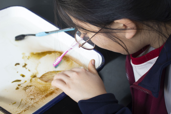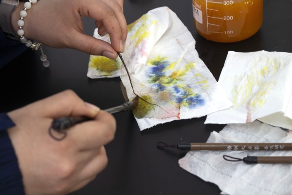 活动现场,太阳成集团122ccvip杨丽老师化身“科普导师”,将植物学知识与手工技艺巧妙结合。从湿地常见植物叶片的选材诀窍,到刷皮去肉的力度把控,从漂白脱脂的科学原理,到染色创意搭配与塑封定型的实操技巧,杨老师层层拆解、细致演示,将专业知识转化为通俗易懂的操作指南。