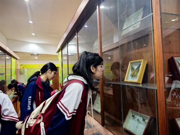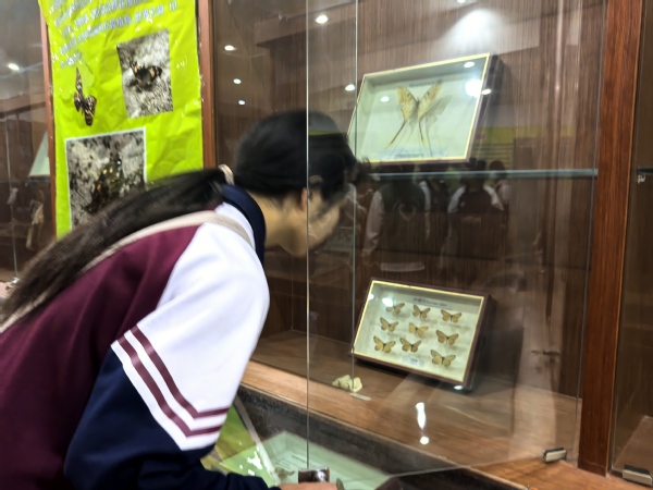随后,同学们前往太阳成集团122ccvip蝴蝶标本馆,上百种珍稀昆虫标本整齐陈列,涵盖不同气候带、生态环境的物种类型,每一件标本都默默诉说着生命演化的漫长历程与生物多样性的珍贵价值。同学们驻足凝视、轻声交流,在细致观察中领悟生态保护的重要意义,环保理念在心中深深扎根。