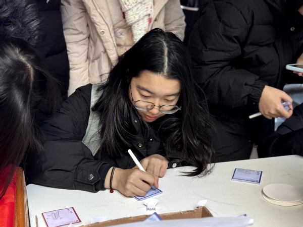 “小狗市集”环节满溢创意与温情。可爱纸小狗展示区前学子驻足,领取心愿卡片写下心里话、未竟愿望或美好祝福后,便可领养专属“心灵陪伴者”;手工创作区内,彩纸、画笔、贴纸等材料一应俱全,同学们或亲手制作独一无二的纸小狗,或为领养的“伙伴”点缀专属印记,指尖翻飞间,乐趣与温暖悄然传递,有效缓解了身心压力。